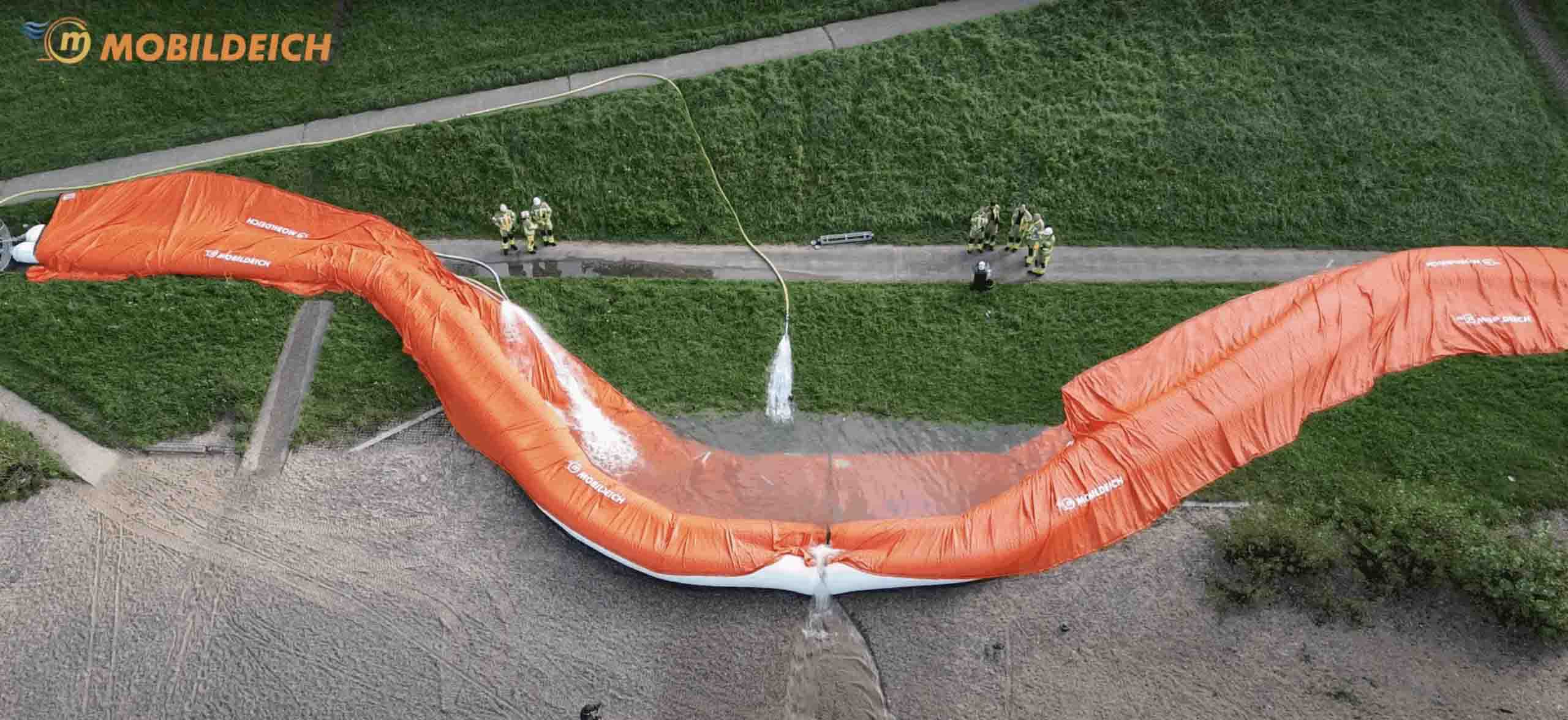 Der MOBILDEICH ist ein innovatives, mobiles Hochwasserschutz-System, das sich in kürzester Zeit aufbauen lässt. Er wird einfach mit Wasser befüllt und nutzt die eigene Masse zur Stabilisierung, also ganz ohne zusätzliches Material. So entsteht in wenigen Minuten eine zuverlässige Flutbarriere gegen selbst extreme Wassermassen.